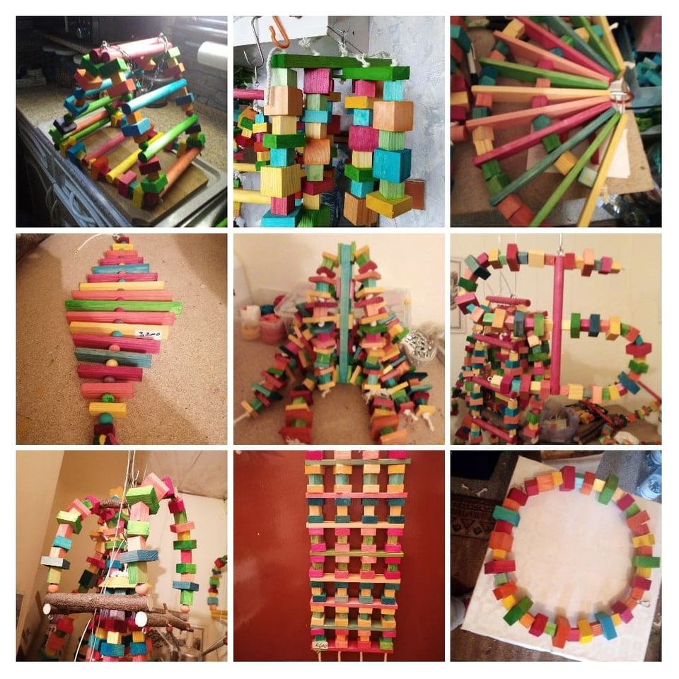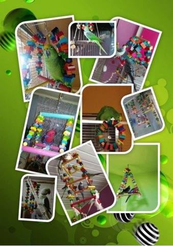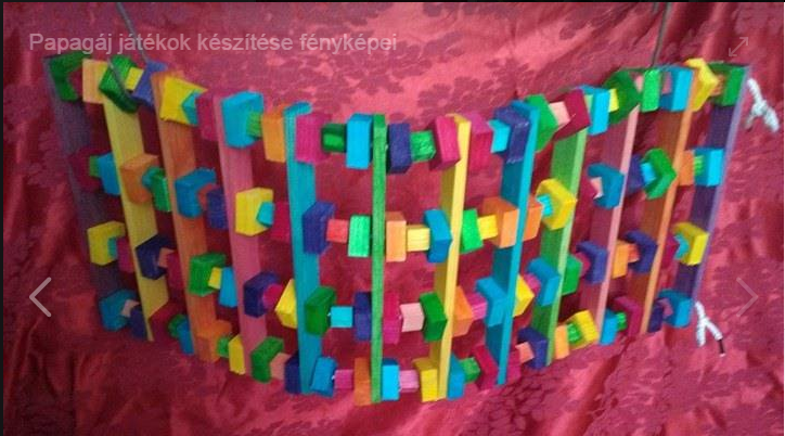 A játékok fenyőből készülnek, len kötéllel és ételfestékkel vannak festve.Ugyan ezek a játékok sem őrök életűek, de remek elfoglaltságot biztosítottak eddig minden papagájunk számára!Az albumokba feltöltött képek a játék mintákat mutatják de természetesen más formát is ellehet készíteni belőlük. Ha van valami ötletetek szívesen veszem ha megosszátok velem.A játékokat egyedileg készítem. Nincs tucat gyártás semmiből. Minden esetben mondjátok milyen méretben kéritek a játékokat mert a képek csalókák nem mindig adják vissza a játék méretét A félreértések elkerülése végett nem mindegy hogy arának egy nimfa méretű játékot küldök vagy fordítva. A csomagokat minden esetben futár szolgálattal küldöm. A játékokat átlehet venni természetesen személyesen is /.Lásd? Elérhetőség/ A játékok árai mérettől változnak. Minden egyes darab külön készül,nem mindig ugyan olyan méretű kockából igy az ár változik.